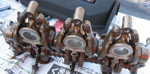 こちら、バルブトレーンを取り外したエンジン側、ロッカーアームassyが無いのでカムシャフトが丸見えになっています